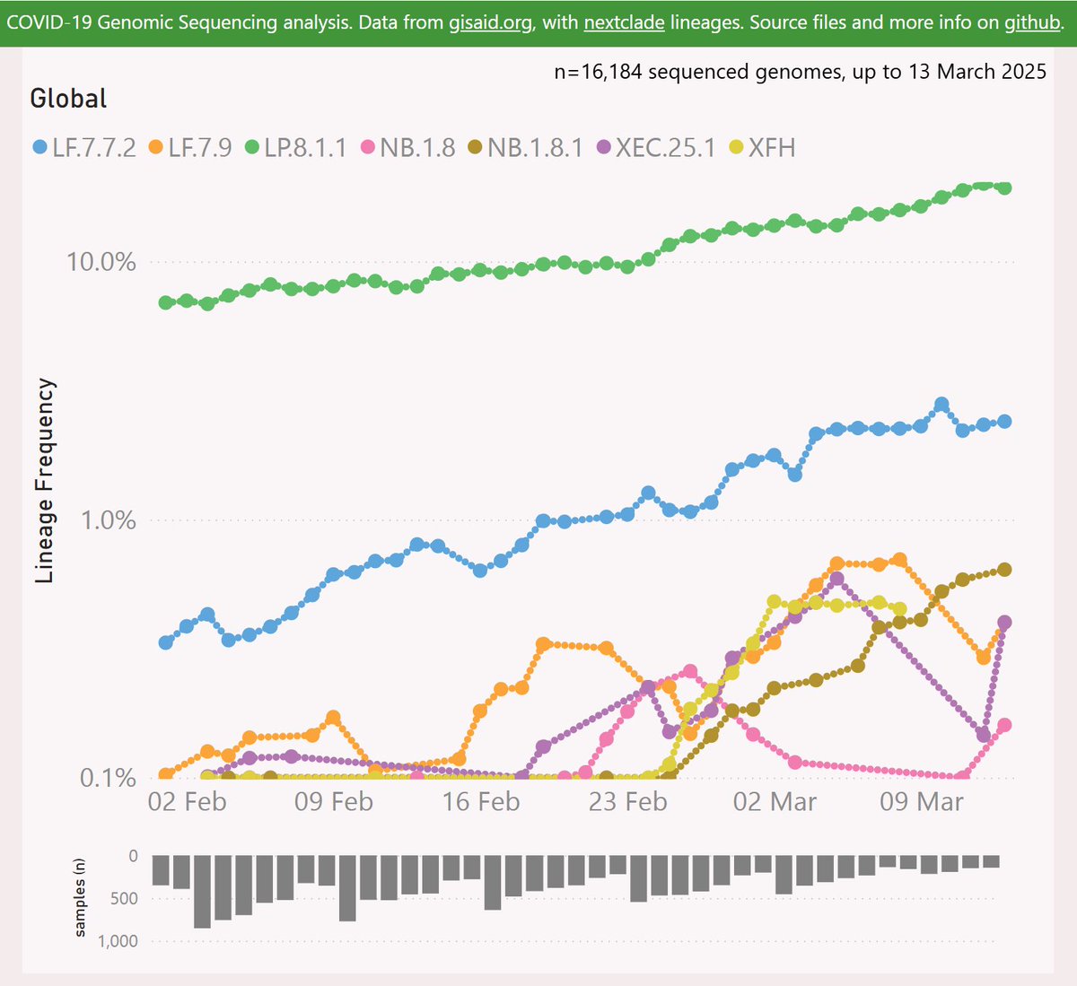 The XEC.* variant has continued to decline, down to 34% by early March. Meanwhile the LP.8.1.* variant grew to around 28%.
