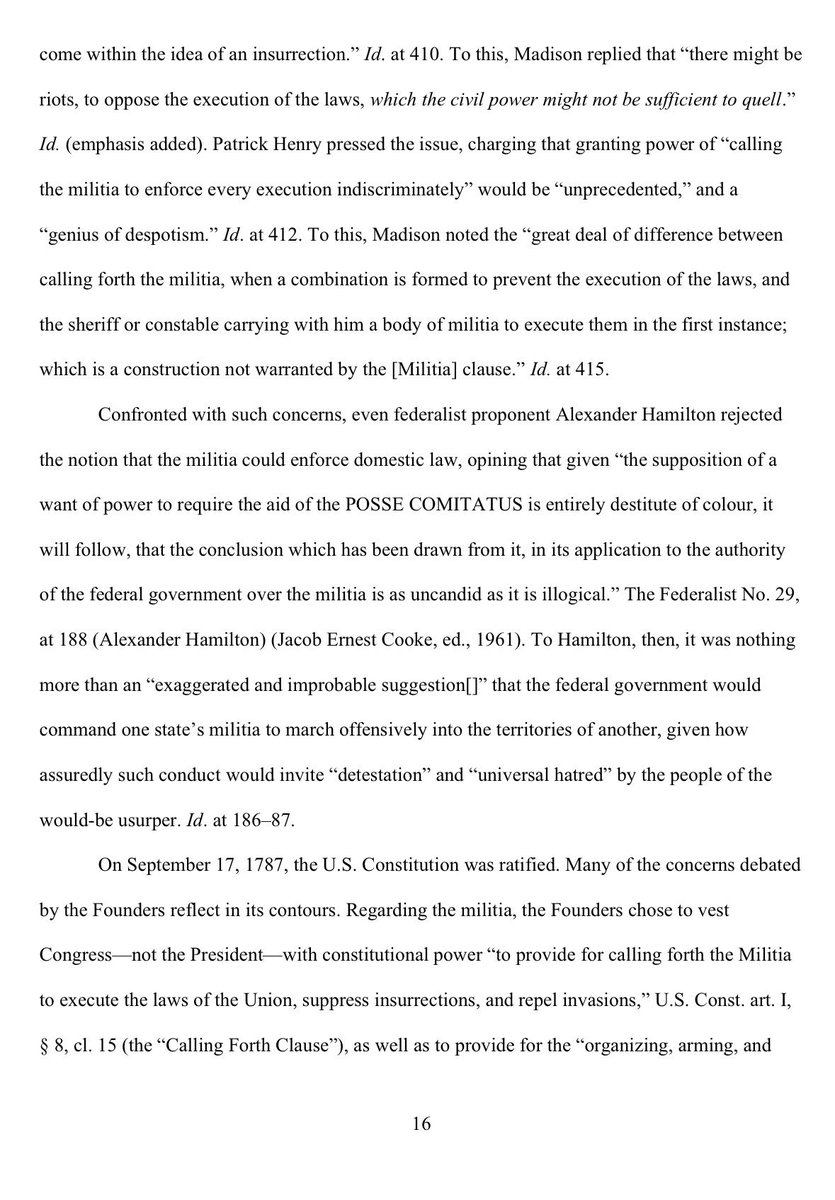 She begins with Alexander Hamilton’s rejection of a “preposterous” idea that the Constitution lets a President deploy a State’s militia to a different State for political retribution.