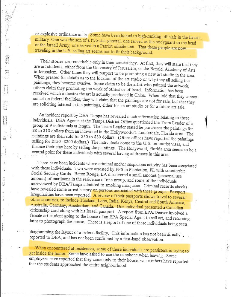 This is not to mention the massive Israeli spying operation on US soil the year leading up to 9/11 called the Israeli art students. Where hundreds of teams of Israeli spies were posing as art students and walking into government buildings to “try to sell art” - yes you are reading that correctly.
