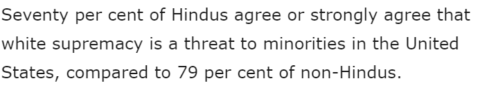 It's easy to abstract away charts showing Indian-Americans being among the strongest supporters of Critical Race Theory, believing that white supremacy is a major threat, and strongly supporting Affirmative Action. Mehta is an illustrative example of this mindset in practice.