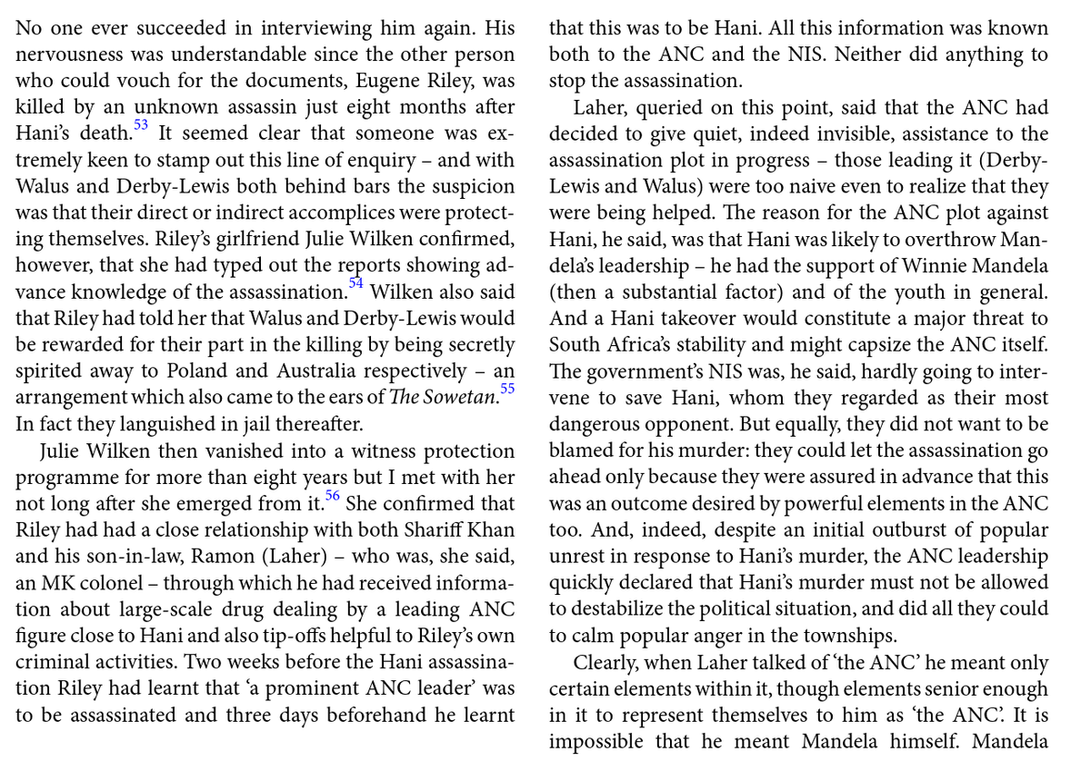 Assassination was a common tool for the ANC elite both in exile and again in power. The author believes the ANC was involved in the assassination of Hani, a left-wing ANC leader, due to his threat to Mbeki.