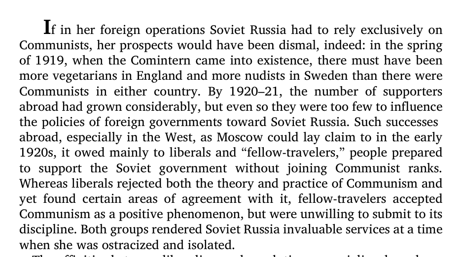 Communists being comparatively rare and treated with suspicion abroad, most Soviet support abroad came from liberals and fellow travelers.