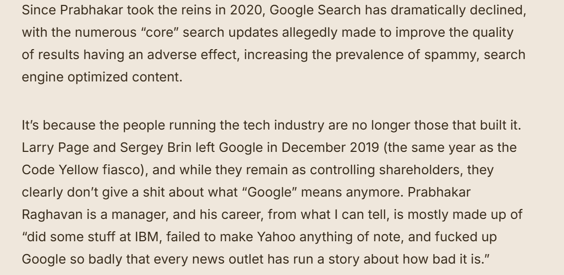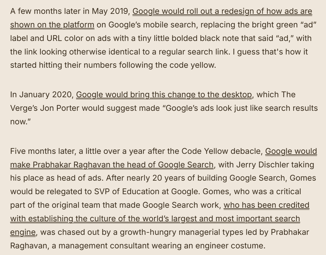 Apparently, Google Search sucking isn't just an SEO and censorship issue. Prabhakar Raghavan, Google head of ads and then search and former head of Yahoo Search [lol], deliberately made it worse so that, by making more queries to try to find things, users would see more ads.