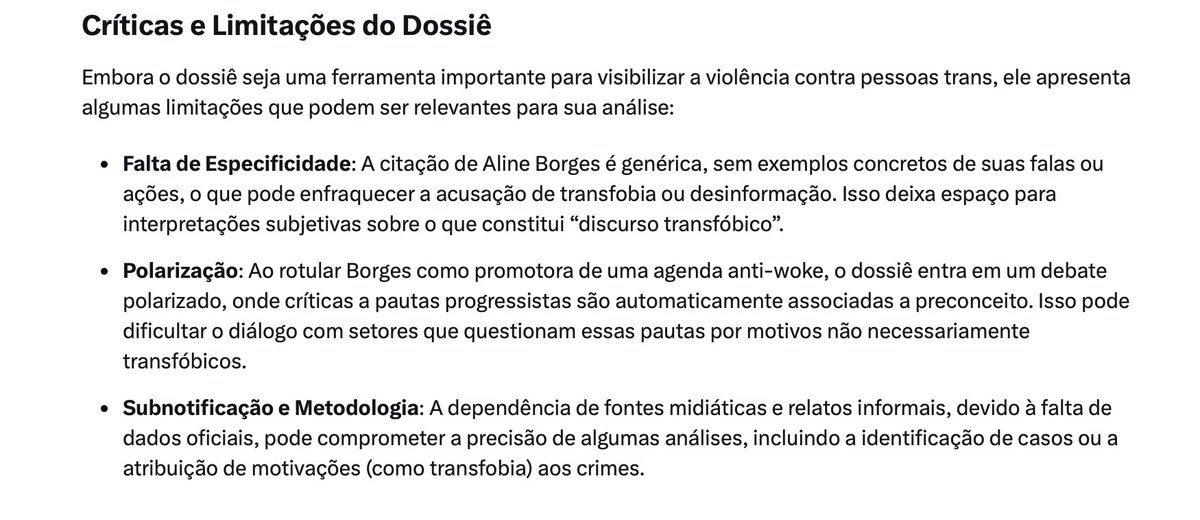 "Falta de especificidade: a citação de Aline Borges é genérica, sem exemplos concretos de suas falas ou ações, o que pode enfraquecer a ACUSAÇÃO DE TRANSFOBIA OU DESINFORMAÇÃO."