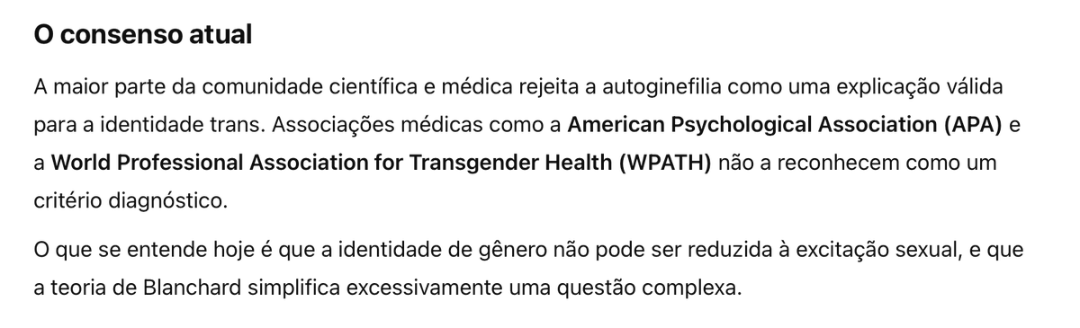 Em uma conversa com Chat GPT, o serviço afirmou que autoginefilia era controverso e ALTAMENTE CRITICADO por pessoas trans e pela comunidade científica, como WAPTH.