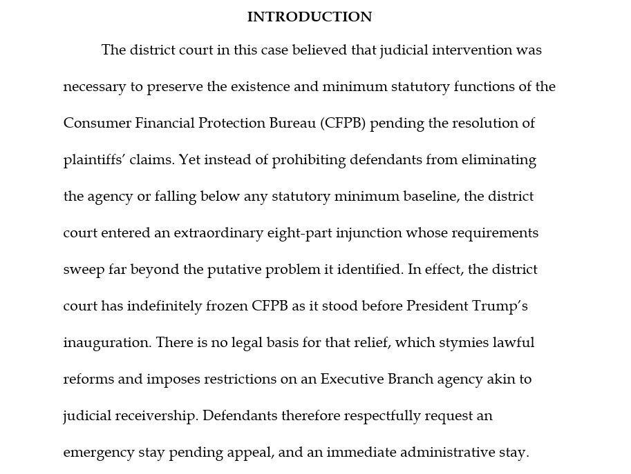 🚨Here's the docket for the appeal of the lower court's injunction requiring reinstatement of grants, employees, etc. of the Consumer Financial Protection Board. 1/