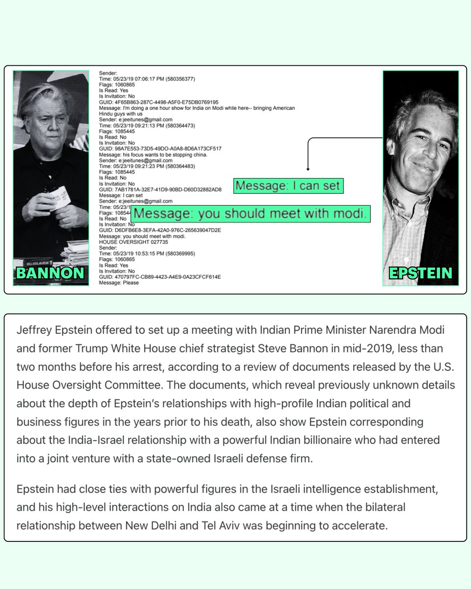 🚨 Exclusive | “Modi on board”: Jeffrey Epstein Pressed Steve Bannon to Meet With Indian PM Shortly Before His Death