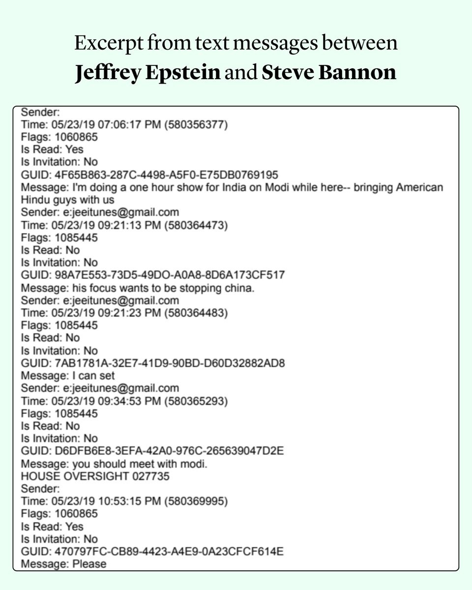 “I can set,” Epstein wrote in a text. “you should meet with modi.” Bannon replied, “please.” Epstein followed by asking, “when can you do it?”
