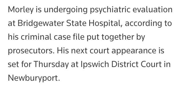 Among Morley’s collection of weapons, bombs, sketches and schematics were dead animals, a stuffed animal that had been “tortured”, and dismantled cell phones. Morley also spent time in Bridgewater, a notorious hospital known for abuse of patients.