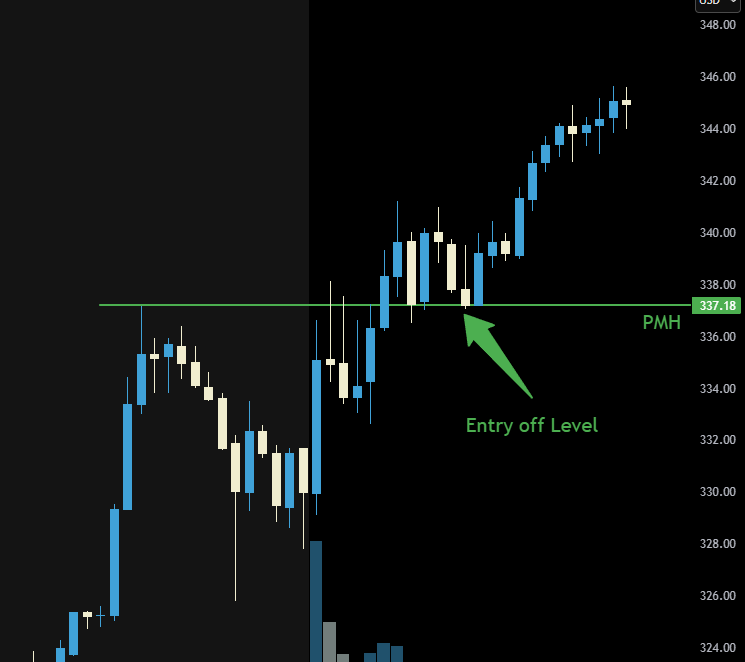 We can see on the chart below the stock broke PMH. The trend is bullish as broke the highs therefore its going "higher" ie Bullish. So we wait for dip to our level to take an entry, see green arrow.