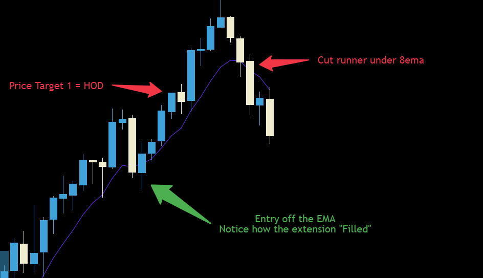 Your price target is almost always the High or Low of the day. This is where you take off majority of your position and leave a runner. You trail your runner with the 8ema until it breaks, see chart below.