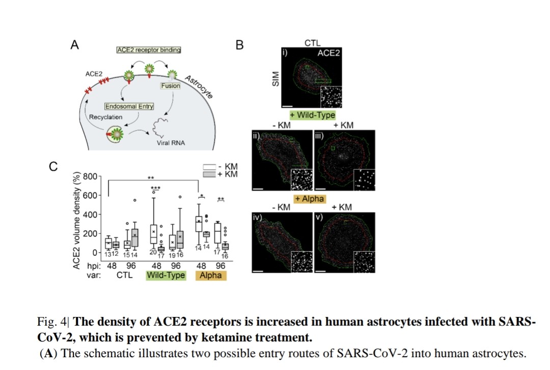 3) Experiments show ketamine, an anesthetic, can reduce astrocyte infection by earlier SARS-CoV-2 variants, but not newer variants. Ketamine does this by decreasing the virus's entry receptor and replication in astrocytes.