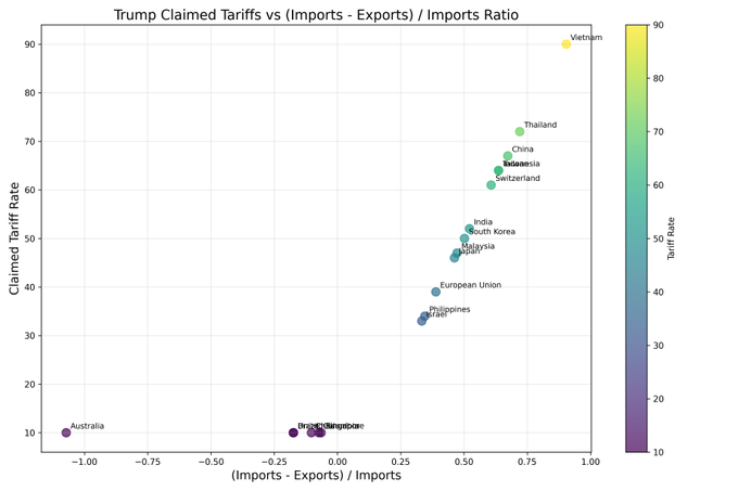 Eh ben apparemment, ils ont appliqué une formule : déficit de la balance commerciale des biens (mais pas des services), divisée par le montant des importations américaines. threads.net/@astro.ig/post…