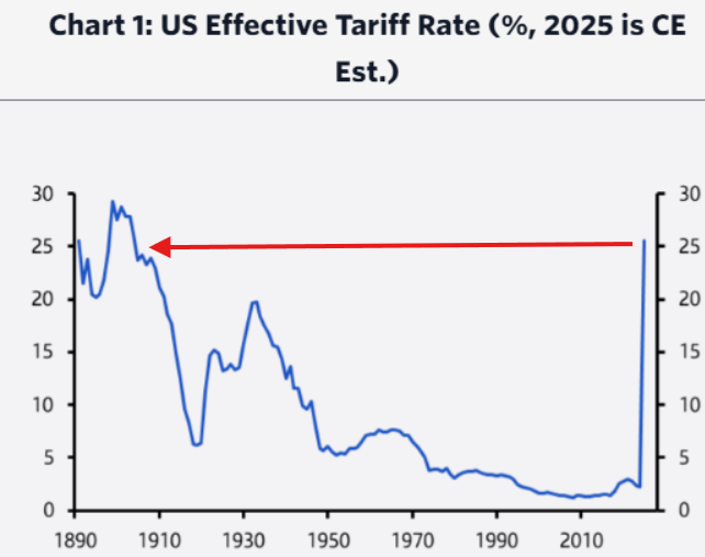 The effective US tariff rate is now above 25% for the first time since ~1900.