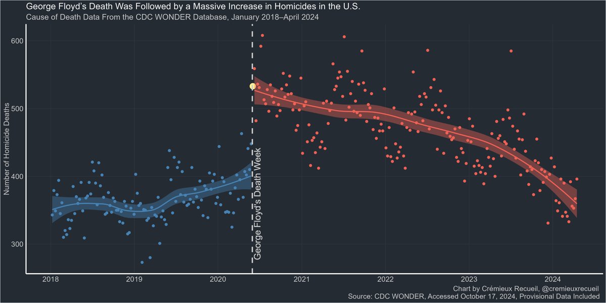 Though America's homicide recently skyrocketed in the days after George Floyd's death, the rate has since returned to normal and is back on track to keep falling.
