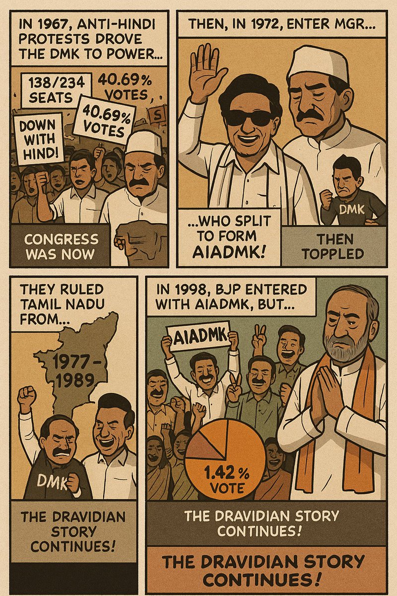 In 1967, DMK toppled Congress, winning 138/234 seats (40.69%). Congress fell to 3 seats by 1969. MGR’s AIADMK ruled 1977-89. BJP’s 1998 entry with AIADMK got 1.42% votes, Hindutva flopped. This saga sets today’s stage!