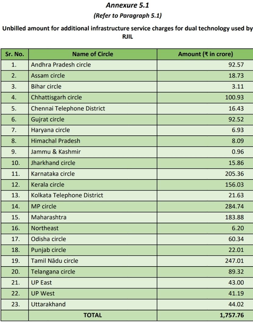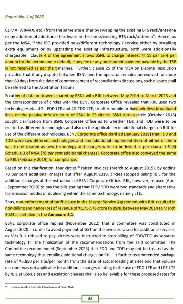 1/ BSNL’s failure to bill Reliance Jio for passive infra sharing cost ₹1,757.76 Cr over 10 yrs (May 2014-Mar 2024). CAG Report (Para 5.1) says BSNL didn’t enforce its Master Service Agreement (MSA). This isn’t a small error