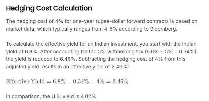 Rupee at 87 vs USD hedging costs 4%, cutting yield to 2.46% (vs. U.S. 4.02%).