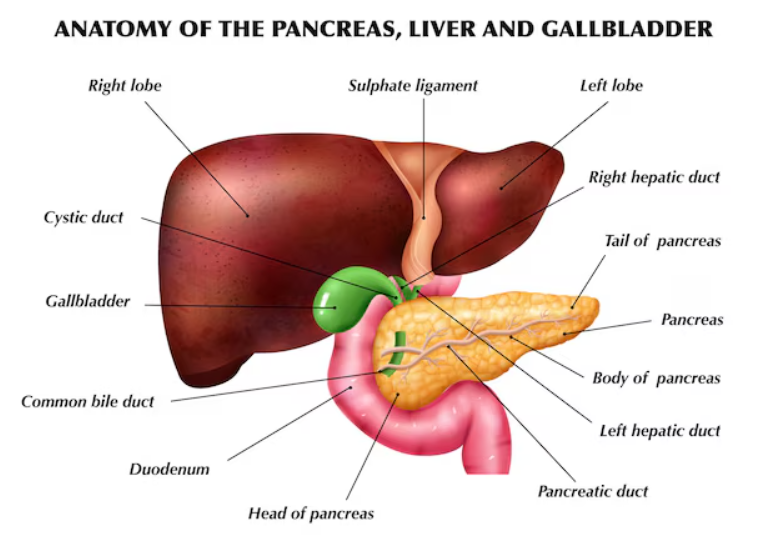 -Bile ducts which are multiple thin tubes that go from the liver to the small intestine which carry bile from the liver and gallbladder, through the pancreas, and into the small intestine.