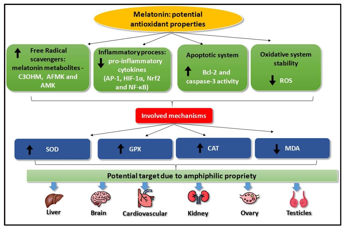 For example, melatonin as an amphipathic free radical scavenger (it has hydrophilic and hydrophobic nature and this dual solubility gives it broader reach (it goes through membranes and blood alike for example)), neutralizes free radicals like superoxide, hydrogen peroxide and the brutal hydroxyl radical.