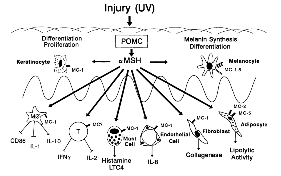 This one is expressed mainly in the hypothalamic arcuate nucleus and nucleus tractus solitarius of the brainstem and stimulates melanocytes to produce eumelanin, inhibits pro-inflammatory cytokines such as IL-6, TNF-alpha, improves our libido (melanotan I and II Synthetic analogs of α-MSH), regulates our appetite, and supports our immune system and brain.