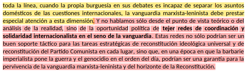 Aún en el actual estado de absoluto repliegue y desorientación ideológica del movimiento comunista internacional, las redes de solidaridad son clave para asegurar la supervivencia de la vanguardia y la continuidad del trabajo hacia la reconstitución.