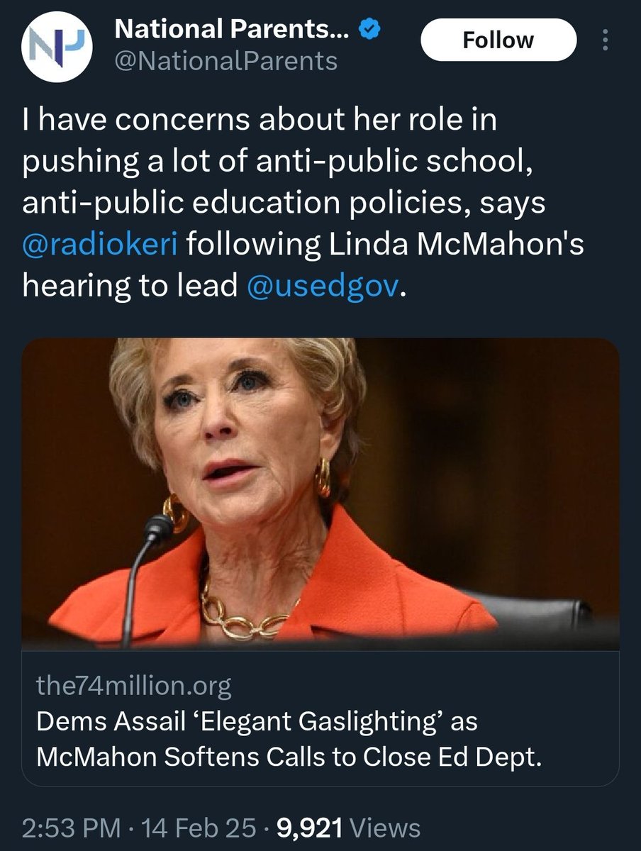 Here's the "National Parents Union" opposing Linda McMahon as Education Secretary.