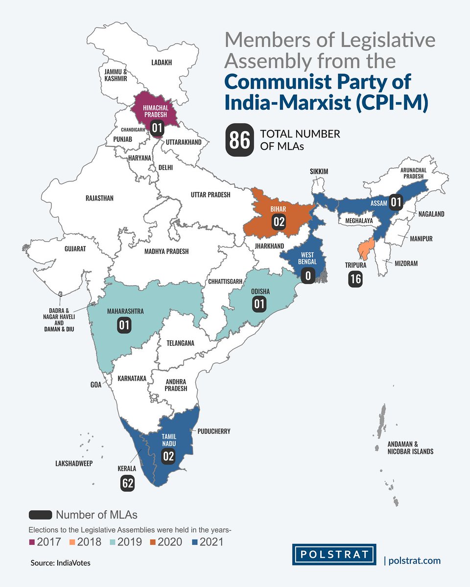 Finalement, le CPI(M) conserve des points dâappuis dans quelques autres Ătats comme le Bihar (grĂące Ă lâalliance avec les autres PC) ou le Tamil Nadu (grĂące Ă lâentente avec le ministre en chef, un nationaliste de gauche laĂŻc) mais peine Ă jouer encore un rĂŽle au niveau national.