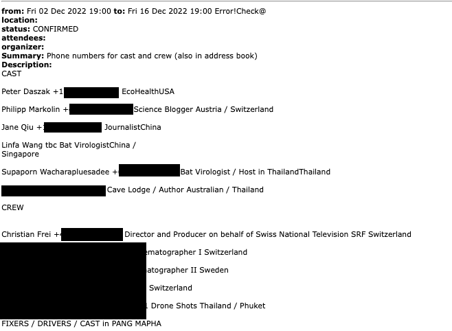 Then the cast of Daszak, the great Markolin (!!), Jane Qiu, Linfa Wang, Supaporn, was put in place by 2 Dec 2022.