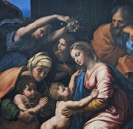 Raphael’s The Holy Family of Francis I depicts the Virgin Mary, infant Jesus, Saint Elizabeth, and young John the Baptist.