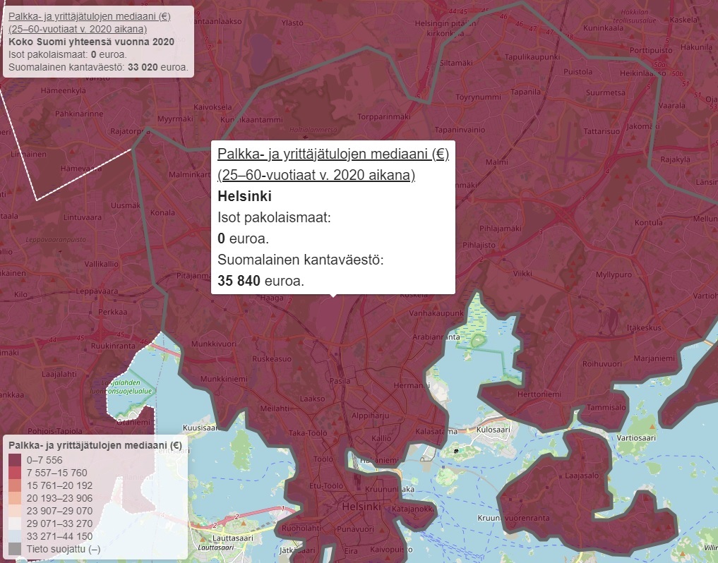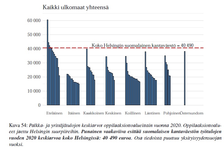 🔹Koko Helsingissä on vain muutama oppilaaksiottoalue -- eteläisessä Helsingissä -- jossa maahanmuuttajien keskiarvo on yli Helsingin suomalaisen kantaväestön keskiarvon (40 090 euroa).