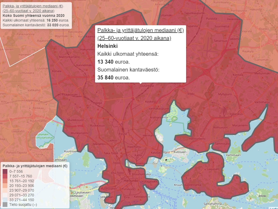 🔹Keskiarvo (ml. nollatuloiset): 22 270 euroa vs. kantaväestön 40 090 euroa. Keskiarvo on vain hieman yli puolet (56 %) kantaväestön keskiarvosta.