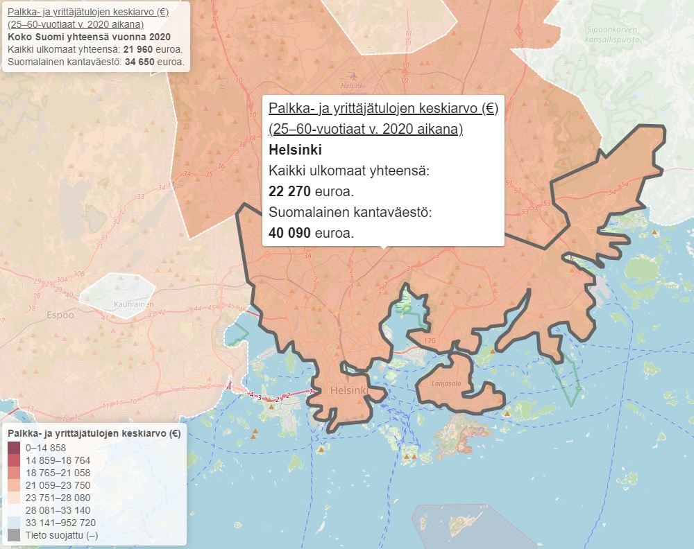 Eli keskipalkka vain ~55 % kantaväestön vastaavasta Espoossa.