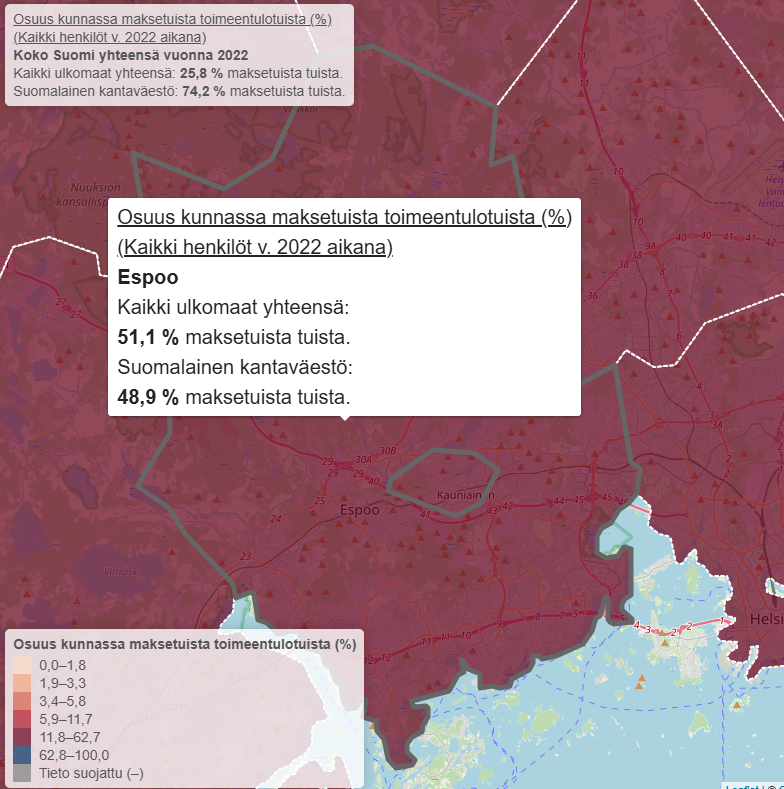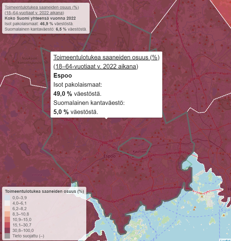Ulkomaalaistaustaisille maksettiin vuonna 2022 jo yli puolet (51,1 %) kaikista Espoon asukkaille maksetuista toimeentulotuista.