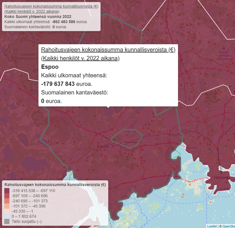 Ulkomaalaistaustaiset maksoivat Espoossa v. 2022 noin 180 miljoonaa euroa vähemmän kunnallisveroja kuin samankokoinen joukko kantaväestöön kuuluvia.