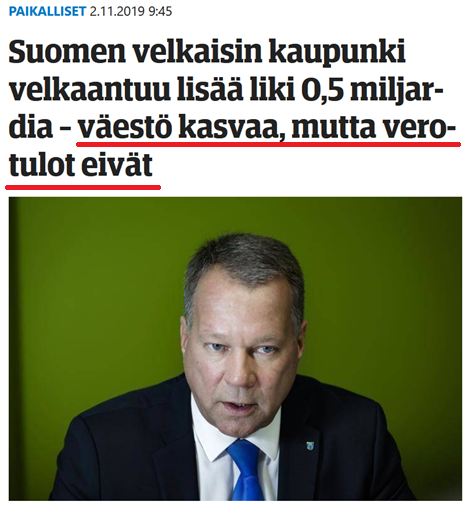 <-- Eli Espoon entisen kaupunginjohtajan sanoin: "Väestö kasvaa, mutta verotulot [per henkilö] eivät".