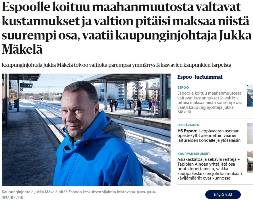Valtion tosiaan pitäisi maksaa enemmän Espoolle ja muilla maahanmuuttajavaltaisille kunnille tästä "rikkaudesta" (HS 4.3.2019).