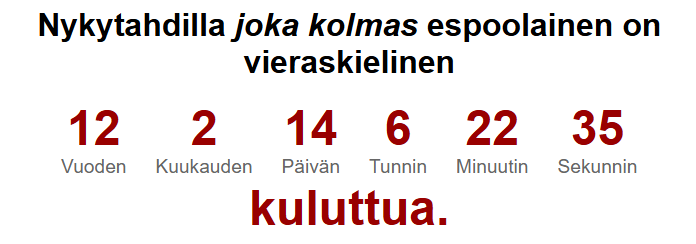 PK-seudun kuntien "virallisen" väestöennusteen mukaan joka kolmas espoolainen olisi vieraskielinen vähän yli 10 vuoden kuluttua.