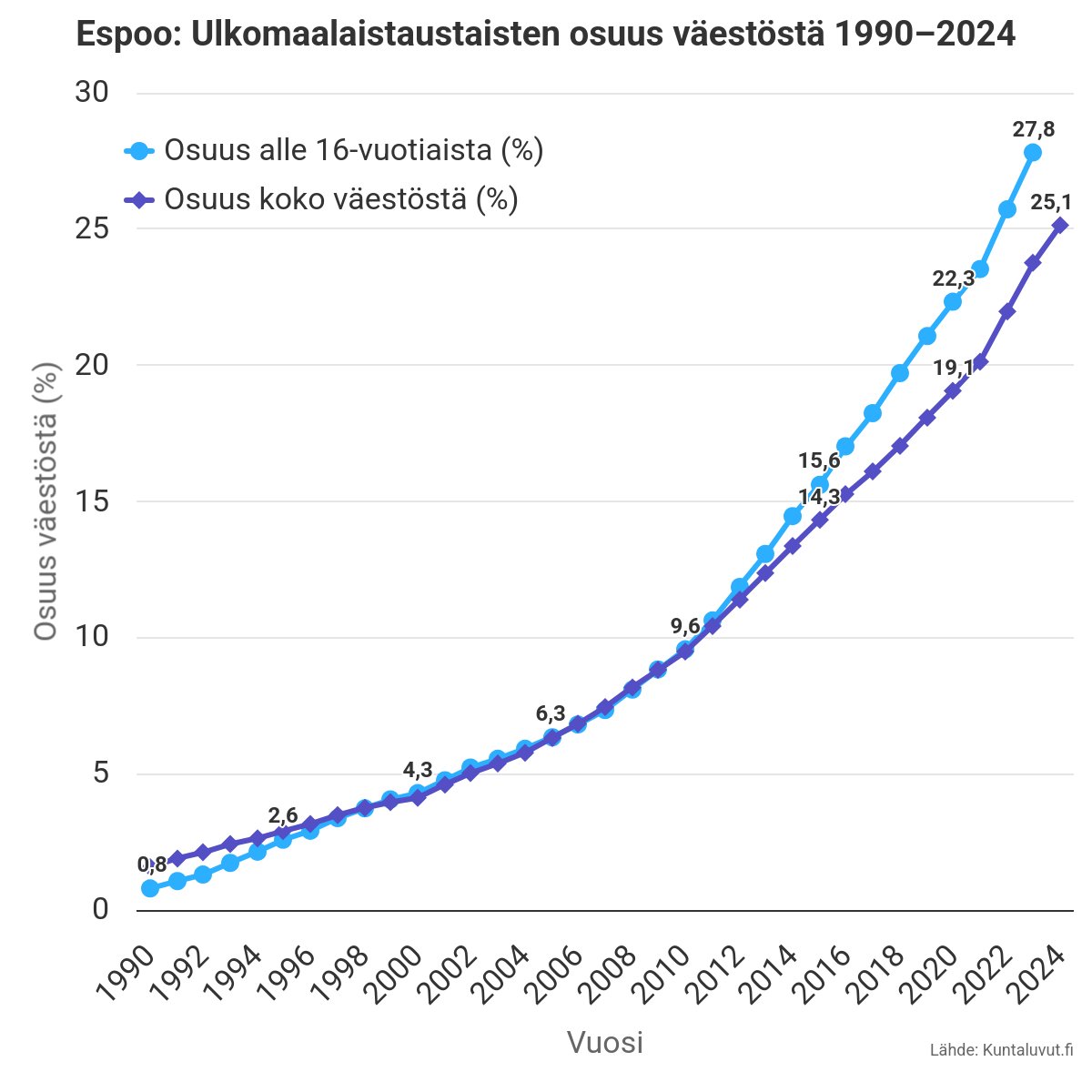 Espoossa ulkomaalaistaustaisten osuus väestöstä kasvaa nopeasti.