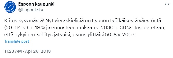 Mainittakoon vielä, että Espoon kaupungin virallisen X-tilin mukaan (vuodelta 2018) työikäisestä väestöstä yli puolet olisi vieraskielisiä vuonna 2053: x.com/EspooEsbo/stat…