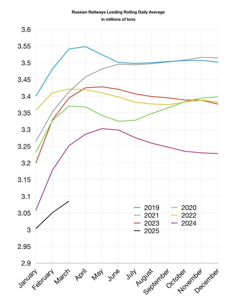This @Prune602 chart shows Russian railways are off by 13% in tonnage loaded, but what it doesn't show are either the lies in the loading statistics or the crowding out of civilian goods transport in the Russian economy by military ones.