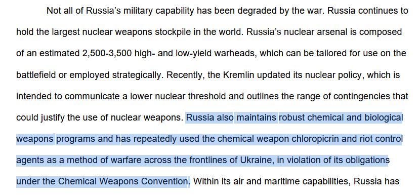 โ ๏ธโฃ๏ธโข๏ธ "Russia also maintains *robust* chemical and biological weapons programs", this is stronger language than what was written in the Department of Defense's 2023 Strategy for Countering Weapons of Mass Destruction.