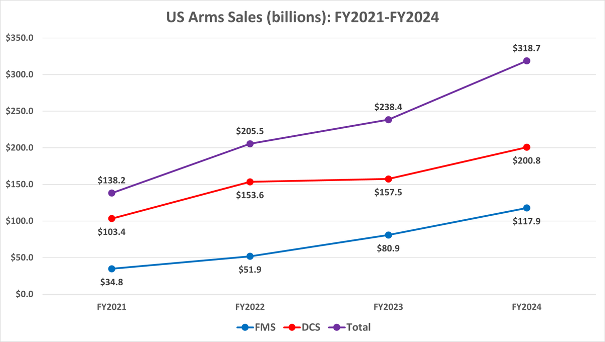 Of the $118 billion in total Foreign Military Sales in FY24, $68 billion, or 58%, was to Europe. From FY17-FY21 it averaged just $11 billion annually, so its up 600%.