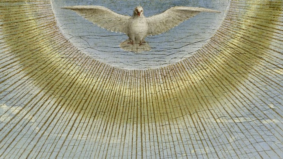Notice the pelican by God's right hand. She feeds her young with blood by piercing her own chest: a symbol of Christ's sacrifice.