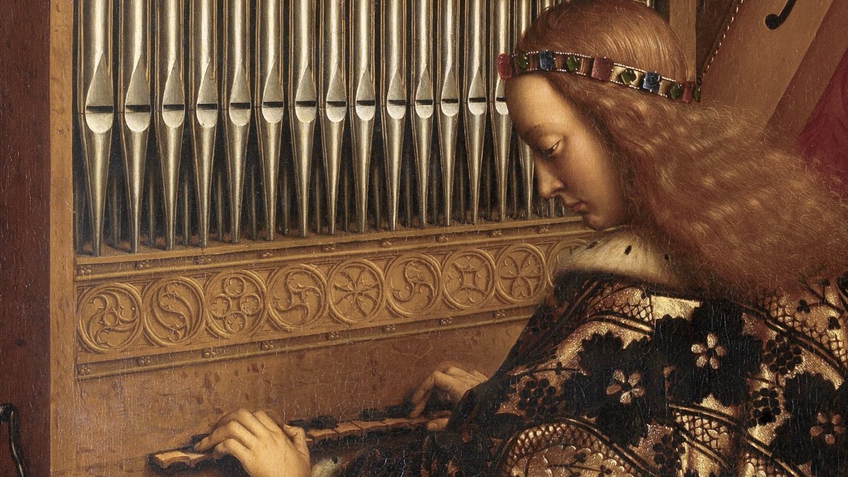 But Van Eyck goes well beyond clever symbols. Look now at the heavenly choir.