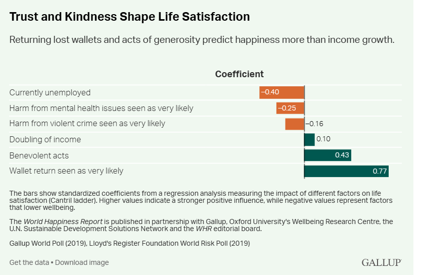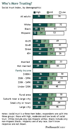 Social trust predicts happiness better than income. In the US, the rural, whites, the wealthy, married, and religious trust others more. Of course, trusting others reflects how trustworthy those you interact with are.
