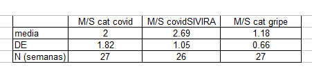 Ahora bien, hay algo curioso, y es que TANTO el SIVIC como el SIVIRA muestran un repunte pronunciado de M/S durante las últimas 4-5 semanas: 5 ± 2,3 (CAT, N=5); 3.93 ± 0.97 (SIVIRA, N=4). De repente el infradiagnóstico sindrómico se ha duplicado...+