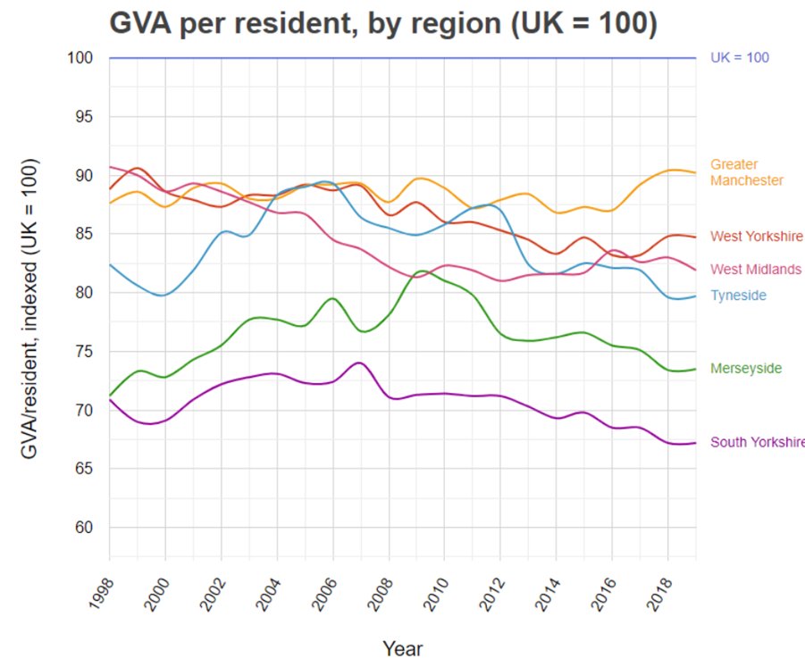 And large cities and their nearby towns in the rest of the country aren’t fulfilling their potential, and have been falling further behind economically (with the exception of a few places e.g. Manchester and Edinburgh).