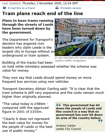 After years of dither, in 2005, the Leeds Supertram project was cancelled, with rising costs & public opposition both cited.