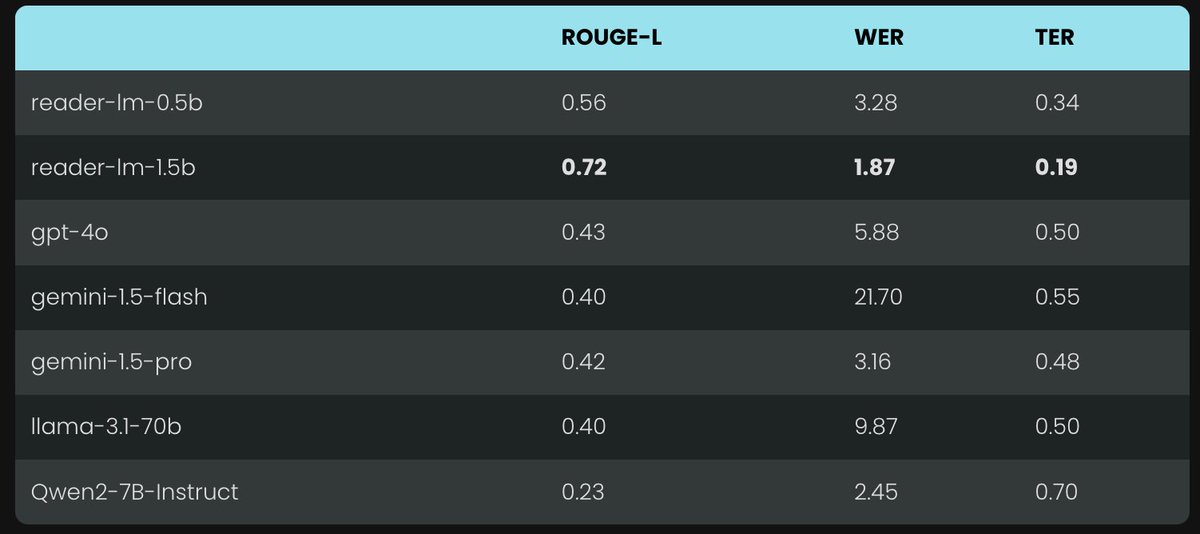 To quantitatively evaluate the performance of Reader-LM, we compared it to LLMs, including: GPT-4o, Gemini-1.5-Flash, Gemini-1.5-Pro, LLaMA-3.1-70B, Qwen2-7B-Instruct. The models were assessed using ROUGE-L, Token Error Rate and Word Error Rate.